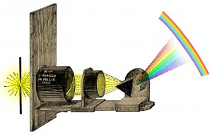 Phénomène figuré sur un ciel peint par l’éclairage en transparence de papiers colorés fixés sur les réserves pratiquées dans la toile. Dès 1864, Jules Duboscq imagine un procédé de lanterne pour projeter l’image spectrale directement à l’avant de la toile grâce à un jeu de lentilles et au passage du faisceau lumineux à travers un prisme.