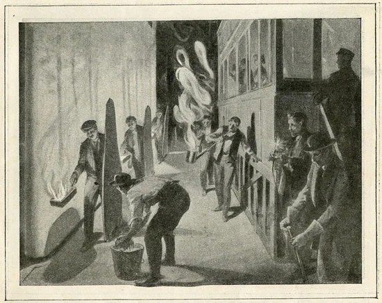 Dans la représentation des grands incendies, les machinistes lancent des morceaux de fulmi-coton imbibés de flamme rouge ou de flamme verte.
